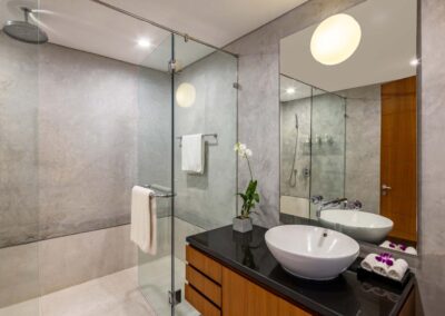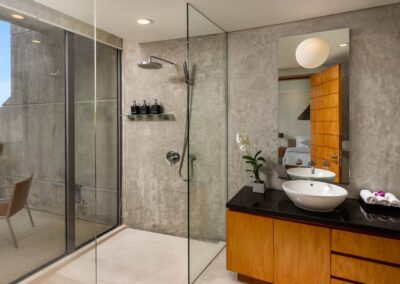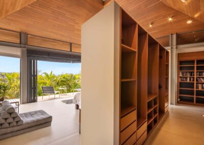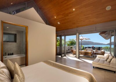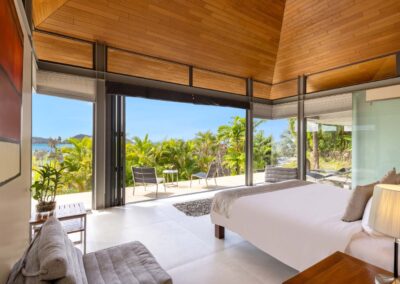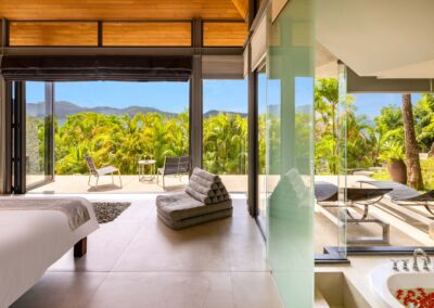 Benjasiri welcomes guests into a dramatic, light-filled living room with double-height vaulted ceilings and full-length glass walls. From here, you can enjoy endless water views through fully retractable doors that open up to the terrace and a 13-meter infinity pool. This floor also features a spacious bedroom and ensuite – the perfect solution for guests with limited mobility.