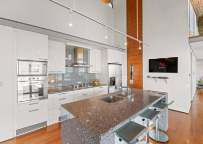 Upstairs, Hale Malia’s expansive living areas invite lazy days idling by the pool. An open-plan layout merges an atrium living room, kitchen and dining area into one airy space, with plenty of plush seating to relax on and admire the views. Out on the terrace, there’s an irresistible 14-meter infinity pool, and an open-air sala pavilion where you can spread out on the couches with a book or a bottle of wine. This level also has a sauna and steam room tucked behind the sala.