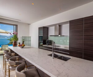 The open plan living, dining, and kitchen area on the main floor serve as the highlight of the villa, where sophisticated earthy interiors merge seamlessly with the inviting infinity pool outdoor, surrounded by six sunbeds and a spacious alfresco dining area. Villa Narissa charms guests to unwind and enjoy the mesmerizing ocean views.