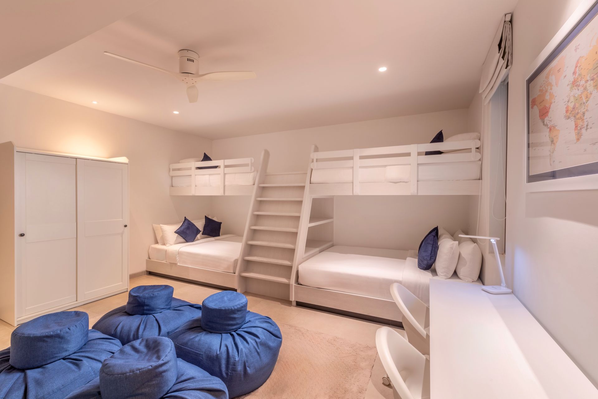 Each luxurious bedroom offers a serene escape, adorned with plush furnishings, private balconies, and ensuite bathrooms. The villa’s two master bedrooms boast elegant spaces, bathtubs and ocean views, while other guest rooms provide lush garden or sea views. The vibrant twin-over-full bunk bed is also complete with bean bags and an ensuite bathroom.
